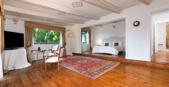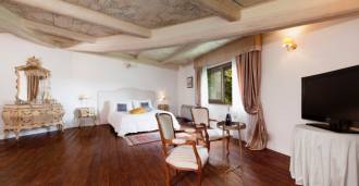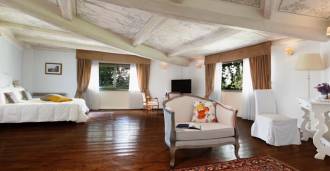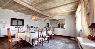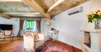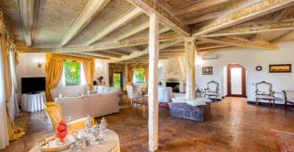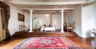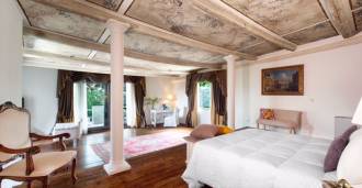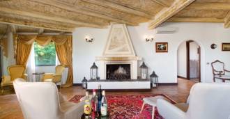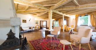 • un amplio salón de recepción con techos pintados a mano y una chimenea de piedra;