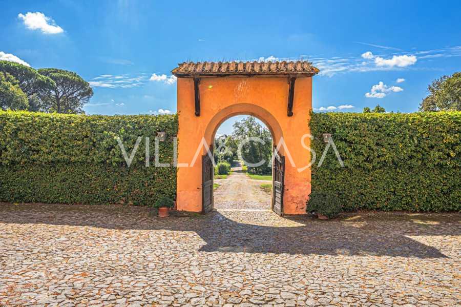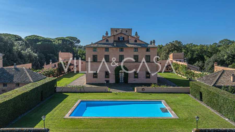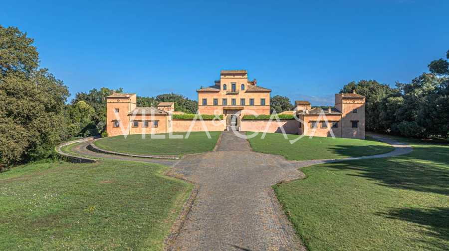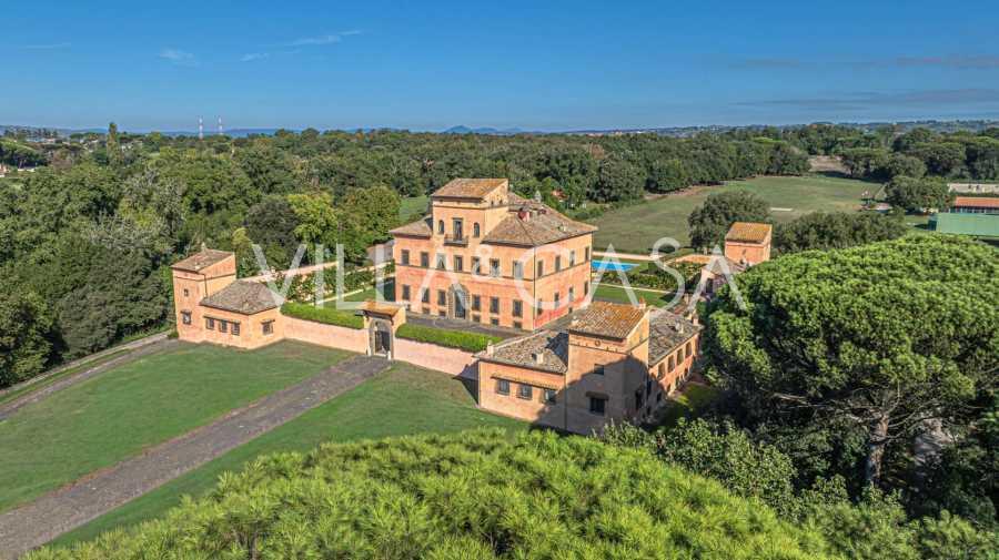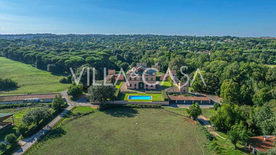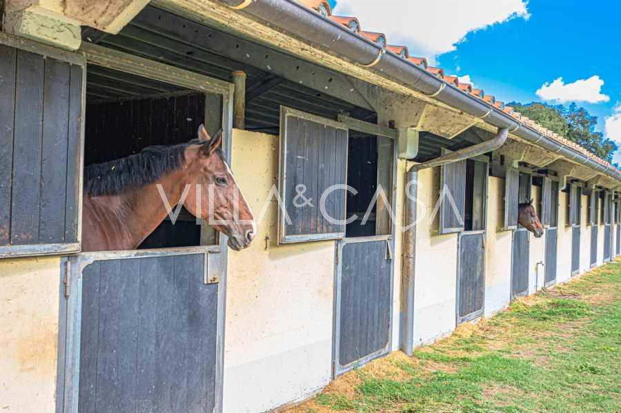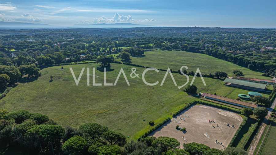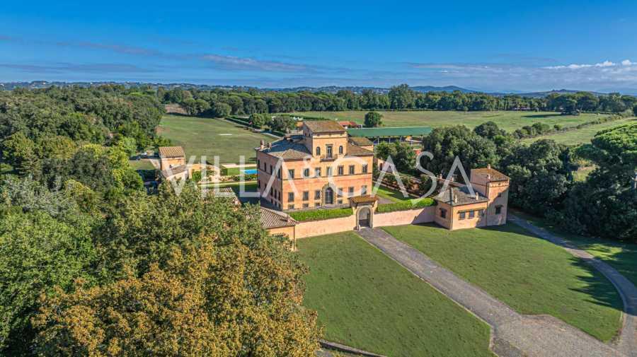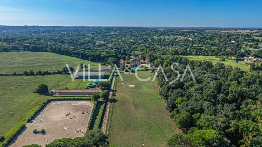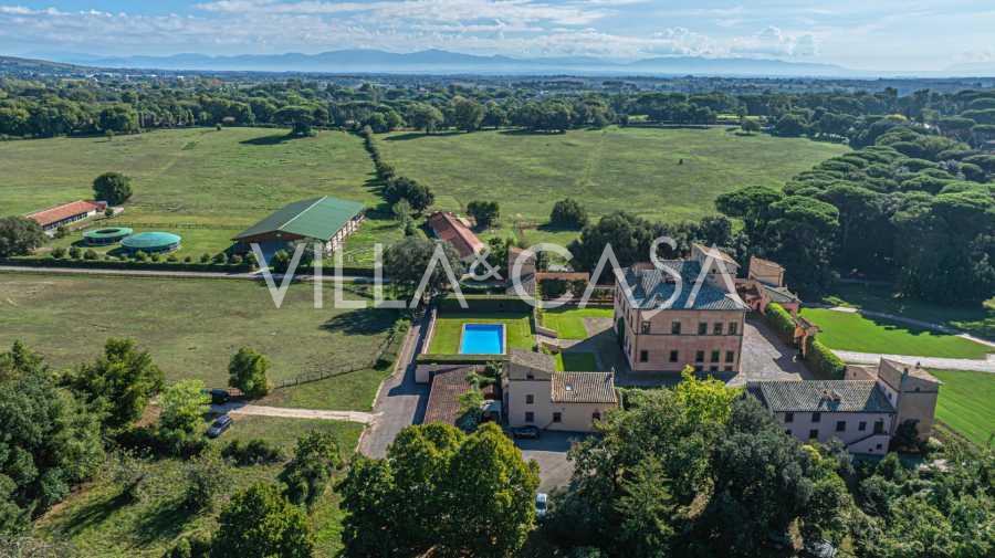 Ubicado a solo veinte kilómetros al norte de Roma, el castillo está rodeado por treinta hectáreas de prados cuidados y bosques antiguos, creando una atmósfera de completa privacidad y armonía con la naturaleza. Aquí nació el legendario caballo de carreras Ribot. Las instalaciones ecuestres están equipadas con los mejores estándares internacionales: dos establos con veintitrés y veinticinco boxes, equipados con salas de montura, áreas de cuidado para los caballos y apartamentos cómodos para el personal. El complejo cuenta con un picadero cubierto para equitación, un carrusel cubierto, un picadero cubierto y extensos pastizales para la cría de caballos, ideales para entrenamientos y competiciones. El castillo colinda con uno de los clubes de golf más prestigiosos de Europa y tiene su propio helipuerto. Las antiguas cuevas etruscas ubicadas en la finca añaden un encanto especial y valor histórico al lugar.