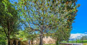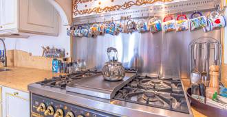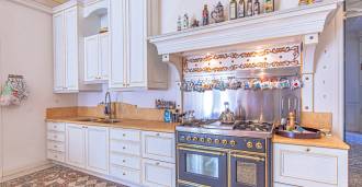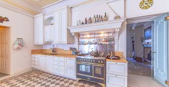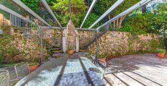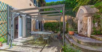 Desde la cocina se puede acceder a un amplio patio privado, ideal para el descanso veraniego y la recepción de invitados: una zona de barbacoa, una pérgola y un jardín en terrazas crean la atmósfera de una casa de campo aislada.