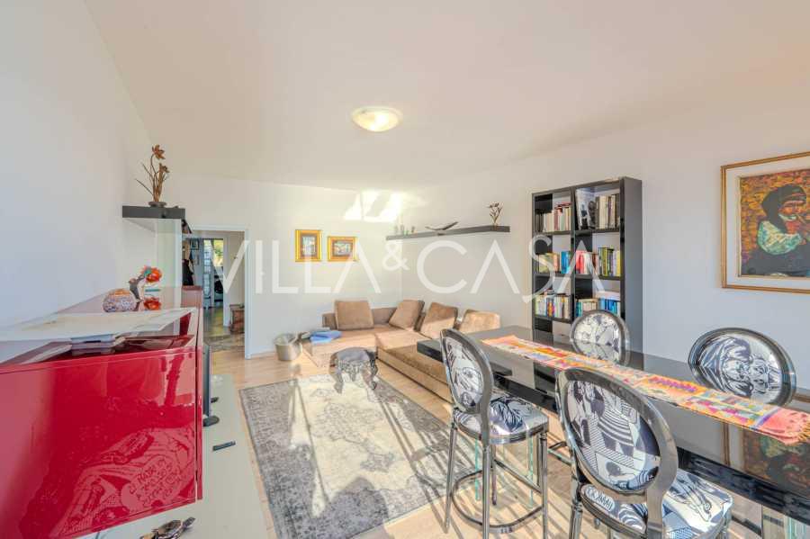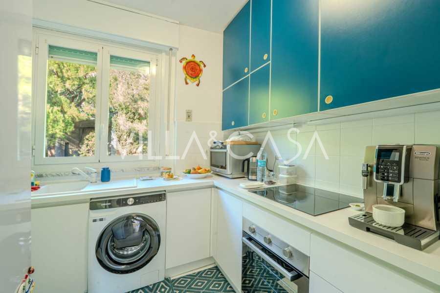 La distribución incluye: sala de estar, despacho, dos dormitorios, uno de ellos con vista al mar, cocina-comedor, dos baños con ventanas, recibidor y pasillo. Calefacción autónoma, posibilidad de instalar aire acondicionado, garaje-box de 20 m² con una altura de techo de 3,50 m y posibilidad de crear un altillo, amplia terraza para relajarse. No hay bodega, pero el garaje compensa el almacenamiento. Los gastos comunes ascienden a 2000 € al año.