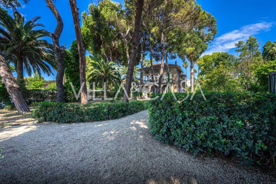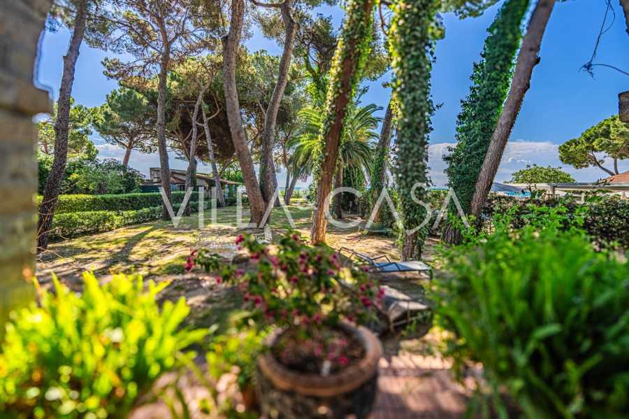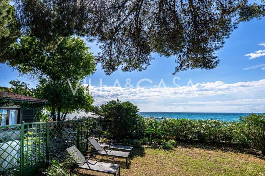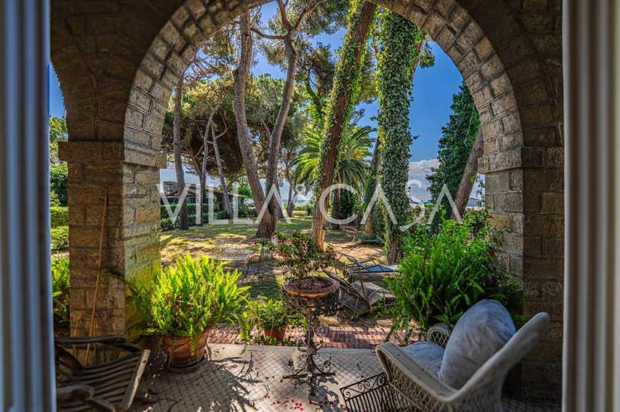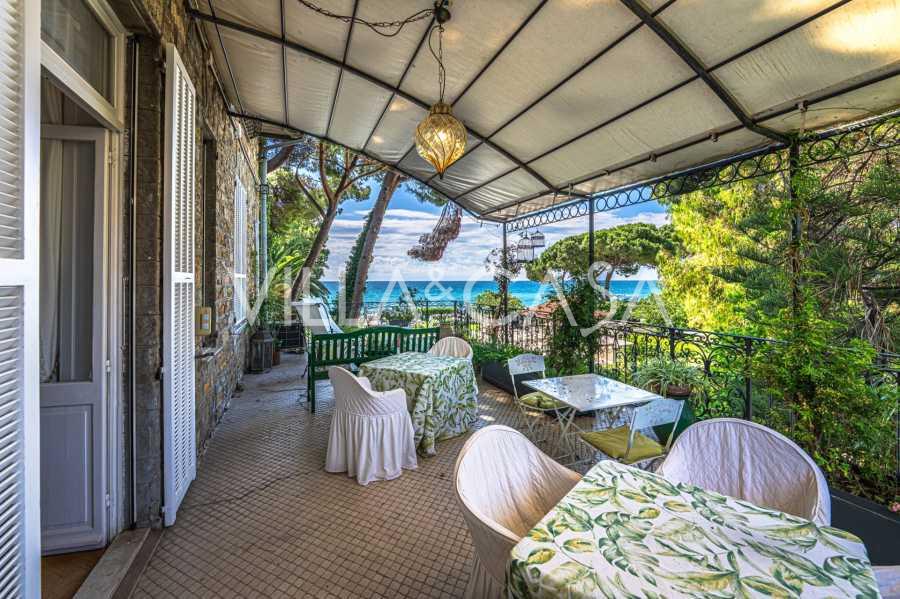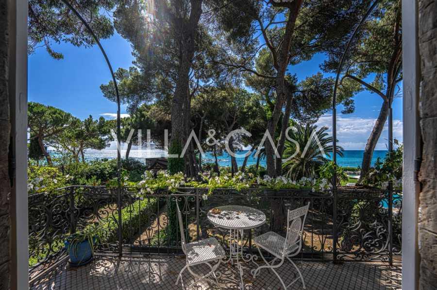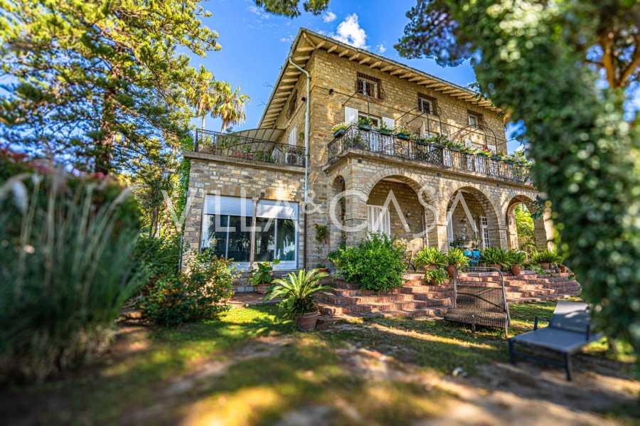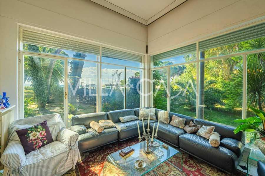 Se vende una elegante villa en primera línea de playa en Diano Marina, diseñada al estilo inglés, con una superficie de aproximadamente 628 m2, distribuida en cuatro niveles. Cuenta con acceso directo al mar y a la playa de arena. La villa está rodeada por un extenso parque de aproximadamente 5000 m2 con pinos mediterráneos centenarios.