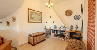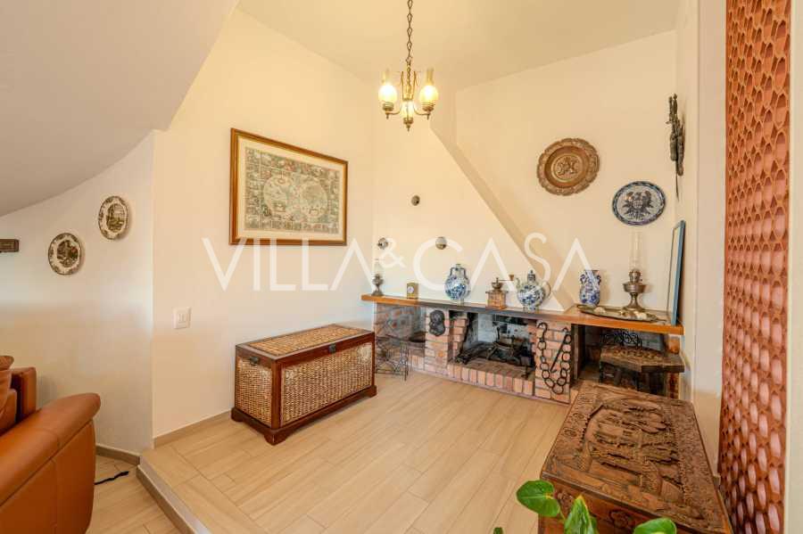 En el segundo nivel: gran sala de estar con chimenea y vista al mar, desde la cual se accede al jardín y al balcón. Cocina también con vista al mar. Cuarto de baño.
